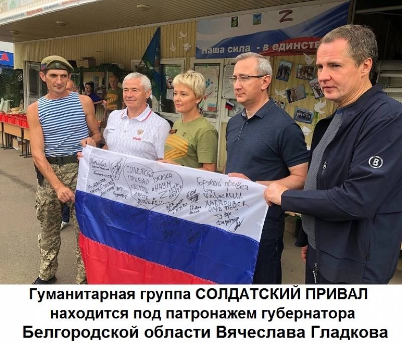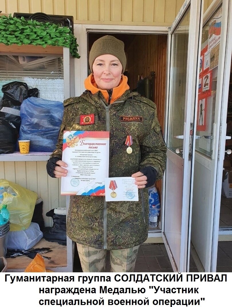 | Наша застава расположена в нескольких километрах от Харьковской области. Мимо нас проходят военные колонны, идущие в сторону границы. На СП#Б мы каждый день БЕСПЛАТНО угощаем наших воинов домашними обедами и раздаем жизненно необходимые в военном быту вещи - теплую одежду, рабочий инструмент, предметы личной гигиены. У нас на Привале воины могут посетить баню, отдать в стирку форму, подстричься. Все вещи, продукты, услуги - это подарок нашим бойцам от волонтёров и неравнодушных жителей нашей страны. Солдатский Привал помогает бойцам всех подразделений любых регионов – мобилизованным, контрактникам, добровольцам. Всем, кто находится на боевом посту. Одежда и обувь служат недолго, считанные недели – боевые действия подразумевают быстрый износ. По этой причине зимой тёплые вещи требуются постоянно – срок их службы не превышает нескольких недель. Зачастую по задачам наши воины находятся в условиях, где невозможно развести костер и просушиться. Мы закупаем стройматериалы – для обустройства и утепления землянок и блиндажей, бензогенераторы, печки-«буржуйки», рабочий инструмент; а также спальники, карематы и ещё многие, многие вещи, необходимые для воинов в холодное время года. Мы делаем все возможное, чтобы помочь с обустройством сурового военного быта и сохранением здоровья наших парней. Они всегда по-доброму, радостно удивляются тому, что помощь приходит из самых разных регионов страны – из Сибири, с Урала, с Сахалина. И всегда очень благодарны за заботу и помощь. Для наших бойцов очень важно видеть и знать, что вся страна поддерживает их. Обратная связь от них есть в наших группах и чатах, в фото и видеоотчётах. Вся информация о нашей деятельности, все отчёты и траты - полностью открыты в группе ВКонтакте https://vk.com/soldatskyprival и Телеграм-канале https://t.me/soldatskyprival. Мы постоянно выкладываем в ленту и чаты фото и видео с Привала, где вы можете увидеть работу нашей заставы. У группы есть сайт https://soldatskyprival.ru/. Наша гуманитарная группа награждена Медалью "Участник специальной военной операции". Группа официально зарегистрирована на сайте добро.рф в качестве организации. О нас есть сюжеты на центральных телеканалах, в том числе - Россия-1 https://vk.com/wall-215842004_1923. Наши контакты есть в группах ВК и Телеграм, вы можете откликнуться на адрес soldatskyprival@mail.ru или написать номер телефона, по которому можно связаться, и удобное время для связи - мы обязательно позвоним. С уважением, застава СОЛДАТСКИЙ ПРИВАЛ #БЕЛГОРОД, руководитель группы Елена Стогниенко, позывной «Русалка». | |