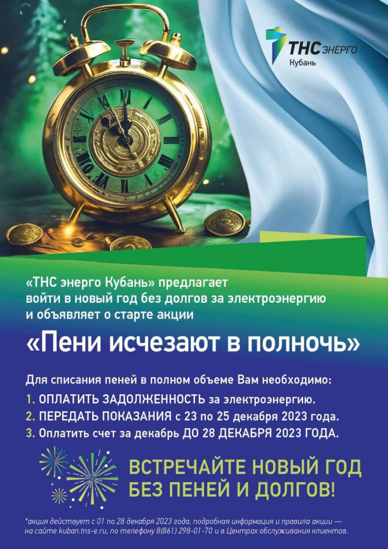 Акция продлится с 1 до 28 декабря. За это время абонентам-физическим лицам, у которых накопились пени, необходимо оплатить задолженность за электроэнергию, передать показания с 23 по 25 декабря и оплатить счет за декабрь до 28 декабря. Проще всего это сделать на нашем сайте, в личном кабинете, мобильном приложении, в офисах компании и кассах партнерских организаций. Для оплаты не нужна бумажная квитанция, достаточно знать номер лицевого счета. Итоги акции «Пени исчезают в полночь» будут подведены до 26 января 2024 года. При выполнении всех условий потребители получат квитанции за январь с аннулированными пенями. «ТНС энерго Кубань» рекомендует не задерживать оплату счетов за электроэнергию, чтобы не допустить ограничение подачи ресурса в новогодние каникулы. Возобновить энергоснабжение будет возможно только после полного погашения долга и возмещения расходов на ограничение/возобновление подачи электроэнергии. Соблюдайте традиции – оставляйте долги в старом году, и тогда новый год будет светлым. | |