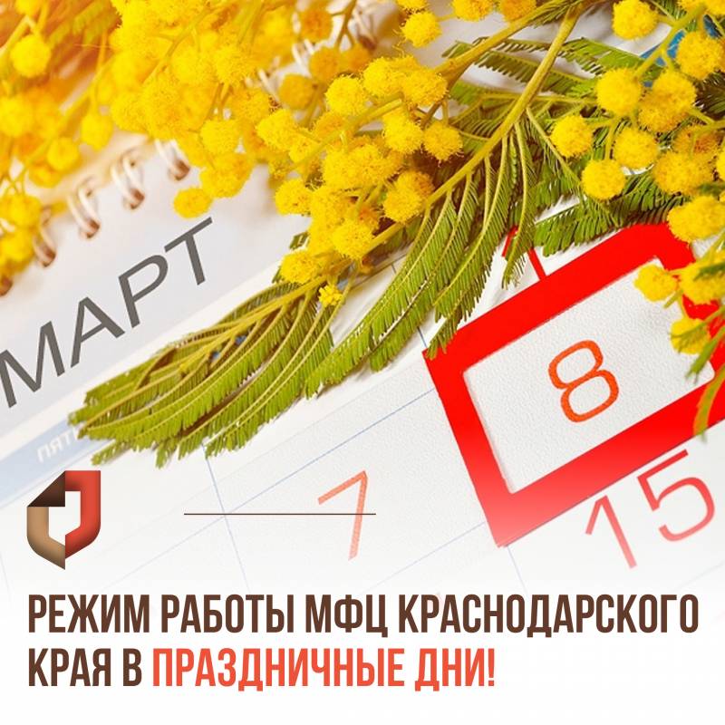 8 марта – выходной, праздничный день. С 9 марта все офисы и ТОСП продолжают работу в штатном режиме по стандартному графику работы, размещённому по ссылке: https://e-mfc.ru/upload/iblock/f3e/z7263gfi2lzd3u8efv3grjle6mbunud7/prilozhenie-03_14_410-ot-17.10.2023.pdf. Просим учитывать данную информацию при планировании визита в МФЦ Краснодарского края. | |