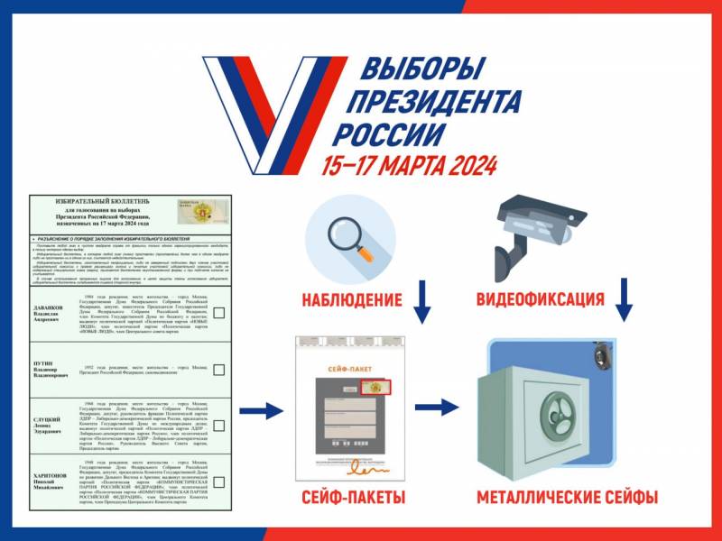 Избирательные комиссии обеспечивают надежное хранение избирательных бюллетеней. Все бюллетени, находящиеся в переносных и стационарных ящиках для голосования, после завершения голосования 15 марта помещаются членами участковых избирательных комиссий в присутствии наблюдателей и представителей СМИ в специальные сейф-пакеты. Сейф-пакеты с избирательными бюллетенями перемещаются для хранения в металлические шкафы, которые закрываются и опечатываются. Каждый металлический шкаф находится в зоне непрерывной видеофиксации записывающих устройств, в том числе в ночное время. Указанные сейф-пакеты, содержащие бюллетени первого дня голосования избирателей, будут вскрыты членами участковых избирательных комиссий в присутствии наблюдателей после 20:00 17 марта 2024 года, когда начнется подсчет голосов избирателей. | |