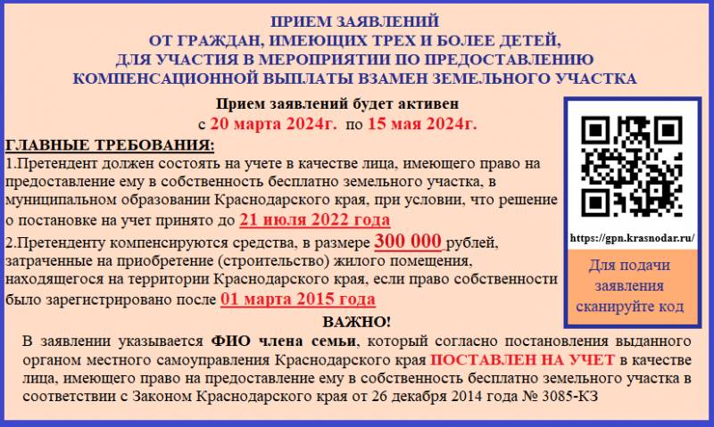 В соответствии с настоящим Порядком компенсационная выплата предоставляется гражданину, имеющему трех и более детей, в отношении которого до 21 июля 2022 г. органом местного самоуправления муниципального образования Краснодарского края принято решение о постановке на учет в качестве лица, имеющего право на предоставление ему в собственность бесплатно земельного участка либо подавшему в установленном порядке до 21 июля 2022 г. заявление о постановке его на учет в качестве лица, имеющего право на предоставление ему в собственность бесплатно земельного участка, при условии последующего принятия решения о постановке на такой учет (далее - Претендент). Претенденту компенсируются средства, в размере 300 000 рублей, затраченные на приобретение (строительство) жилого помещения, находящегося на территории Краснодарского края, если право собственности было зарегистрировано после 01 марта 2015 года. Прием заявлений осуществляется в сроки, устанавливаемые правовым актом министерства. Согласно приказа министерства от 15 марта 2024 г. N2 203 прием заявлений будет осуществляться с 20 марта 2024 г. по 15 мая 2024 г. Подать заявление об участии в мероприятии можно в форме электронного документа через сайты министерства или учреждения (mintekgkh.krasnodar.ru, кубцентр.рф). | |