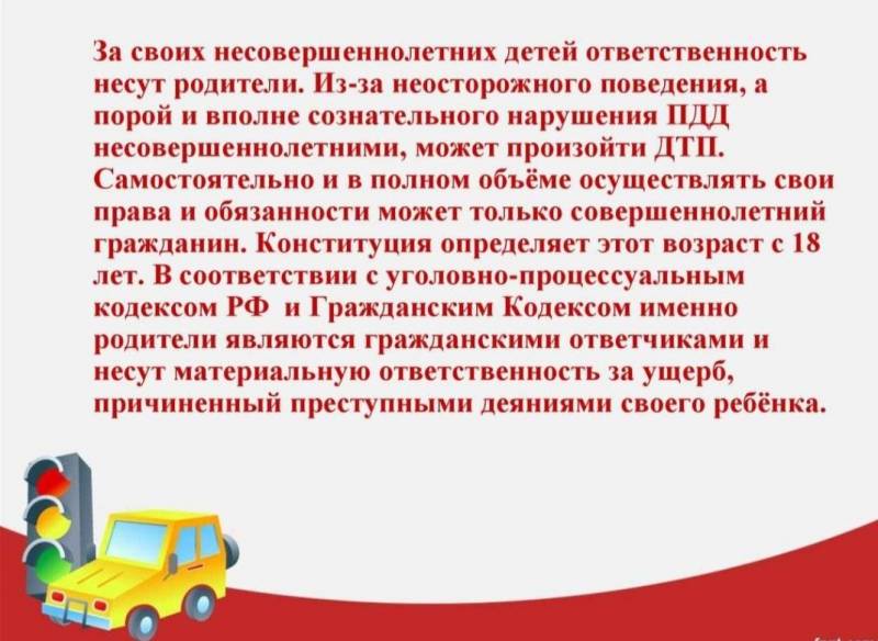 | Улица полна неожиданностей и соблюдение правил дорожного движения поможет снизить риск возникновения опасных ситуаций на дорогах. Уважаемые родители, помните, что жизнь и безопасность детей на дорогах зависят от Вас – учите детей безопасному поведению на дороге, в первую очередь, своим примером! Каждый должен четко усвоить, что правила дорожного движения-это закон для всех, соблюдение которого является обязательным. И родители и несовершеннолетние обязаны знать не только свои права и обязанности, как участников дорожного движения, но и к каким последствиям может привести их нарушение. | |