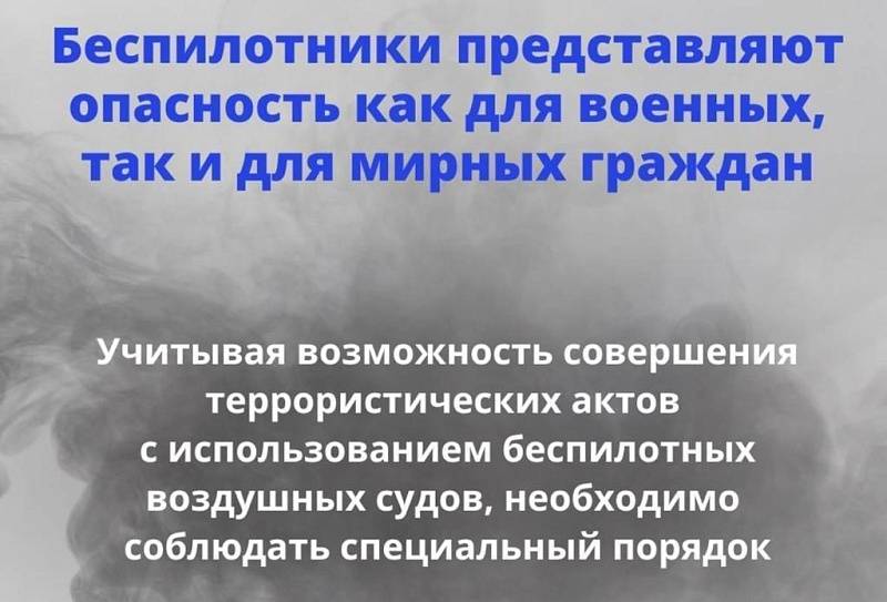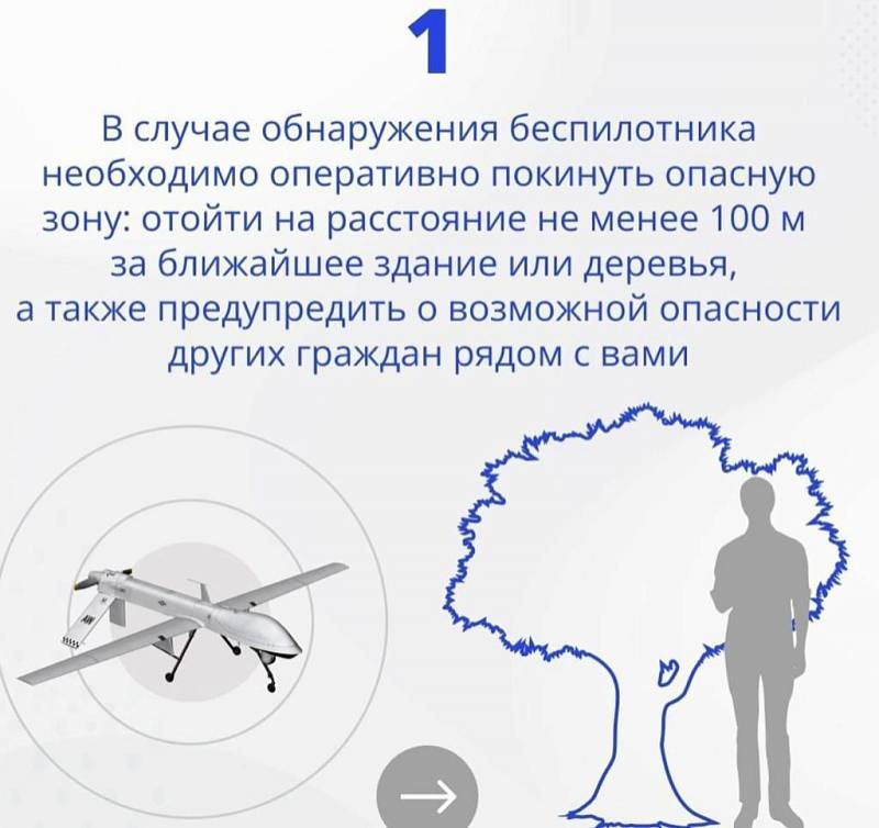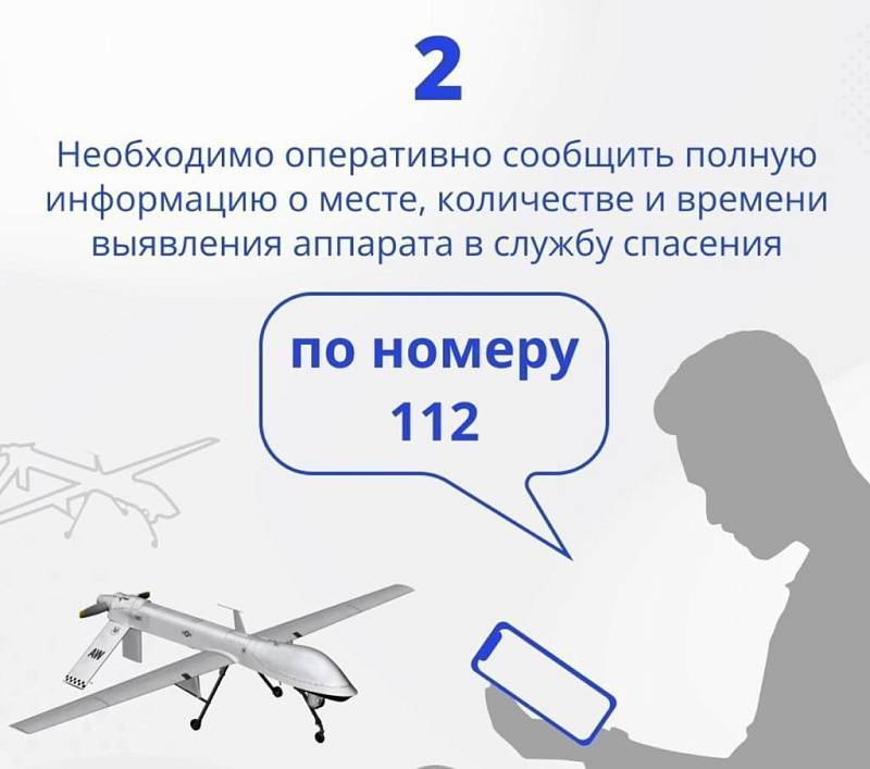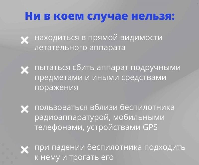| Что делать в такой ситуации? Беспилотники могут использоваться для совершения террористических актов, поэтому при их обнаружении нужно соблюдать специальный порядок действий. Если вы заметили беспилотник, то нужно немедленно отбежать на расстояние не менее 100 метров от места обнаружения. Необходимо укрыться за ближайшими зданиями или деревьями, а также предупредить других людей о возможной опасности. В безопасном месте необходимо позвонить в единую дежурно-диспетчерскую службу и сообщить о местоположении, количестве беспилотников и времени их обнаружения. Ни в коем случае нельзя оставаться в прямой видимости беспилотника, пытаться его сбить, пользоваться рядом с ним телефонами, устройствами GPS и радиоаппаратурой. Если беспилотник упал, то к нему нельзя подходить и трогать. | |