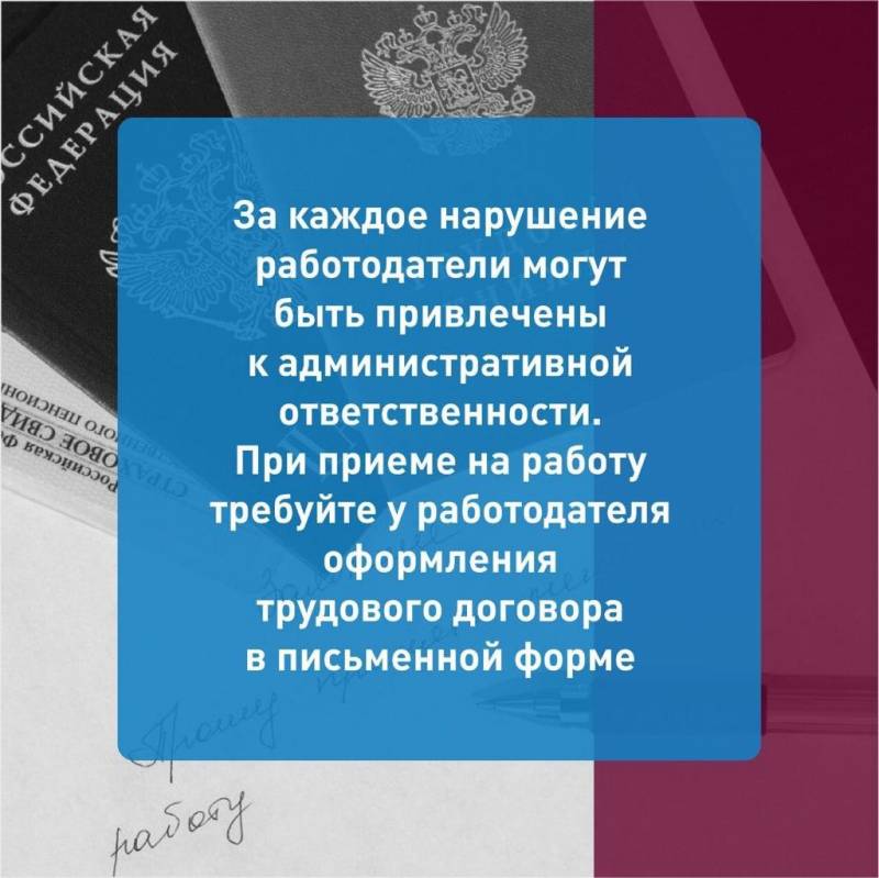 Дата публикации: 1 ноября 2024 ![]() Знай свои права. Ваши трудовые права могут быть нарушены. Если работодатель не спешит подписывать с вами трудовой договор, оформлять приказ о приеме на работу, не требует представить трудовую книжку или сведения о трудовой деятельности, страховое свидетельство обязательного пенсионного страхования (если оно ранее было оформлено) и обещает со дня на день выполнить все эти условия, но каждый раз устанавливает под различными предлогами новые сроки, то ваши трудовые права нарушены. Бывает, что работодатель, не желая обеспечивать работника положенными по Трудовому кодексу РФ гарантиями и компенсациями, при приеме на работу прибегает к заключению договора подряда или договора на оказание услуг (гражданско-правового). Такие действия – это скорее сознательная манипуляция, серьезным образом ущемляющая права работников. С вами должен быть заключен именно трудовой договор, в котором должны содержаться положения о подчинении работника правилам внутреннего трудового распорядка, месте и времени выполнения работы, фиксированном размере вознаграждения за труд, условиях труда на рабочем месте. Оформление приема на работу Письменный трудовой договор заключается как с постоянными, так и временными работниками, по основному месту работы и при совместительстве, с надомниками и т.п. Работник обязан приступить к исполнению трудовых обязанностей со дня, определенного трудовым договором (если день не оговорен – на следующий рабочий день после вступления договора в силу). Согласование и четкое определение обязанностей в трудовом договоре необходимо и работодателю и работнику. Работодателю это дает возможность осуществить рациональное распределение работ и эффективную организацию труда, оценить занятость работника, а для работника создает определенность относительно объема выполняемых работ и его оплаты, гарантирует возможность правильного решения спорных вопросов. Работник теряет при отсутствии трудового договора право: - на рабочее место, соответствующее государственным нормативным требованиям охраны труда и условиям, предусмотренным коллективным договором; - на возмещение вреда здоровью, причиненного в связи с исполнением им трудовых обязанностей, и компенсацию морального вреда; - на выплату заработной платы своевременно и в полном объеме; - на возмещение командировочных расходов; - на перерыв для отдыха и питания; - на еженедельные выходные дни, нерабочие праздничные дни; - на оплачиваемый ежегодный отпуск; - на оплату временной нетрудоспособности; - на пособие по беременности и родам, по уходу за ребенком; - на выходное пособие при сокращении численности или штата работников; - на прочие гарантии, установленные трудовым законодательством. Контроль и надзор за соблюдением трудового законодательства осуществляется Государственной инспекцией труда и прокуратурой. Что "говорит" закон? Трудовые отношения возникают между работником и работодателем на основании трудового договора, заключаемого ими в соответствии с Трудовым кодексом РФ. Трудовой договор должен быть составлен в двух экземплярах, каждый из которых подписывается обеими сторонами. Один экземпляр передается работнику, а второй – остается у работодателя.Работодатель обязан оформить с работником, фактически допущенным к работе, т