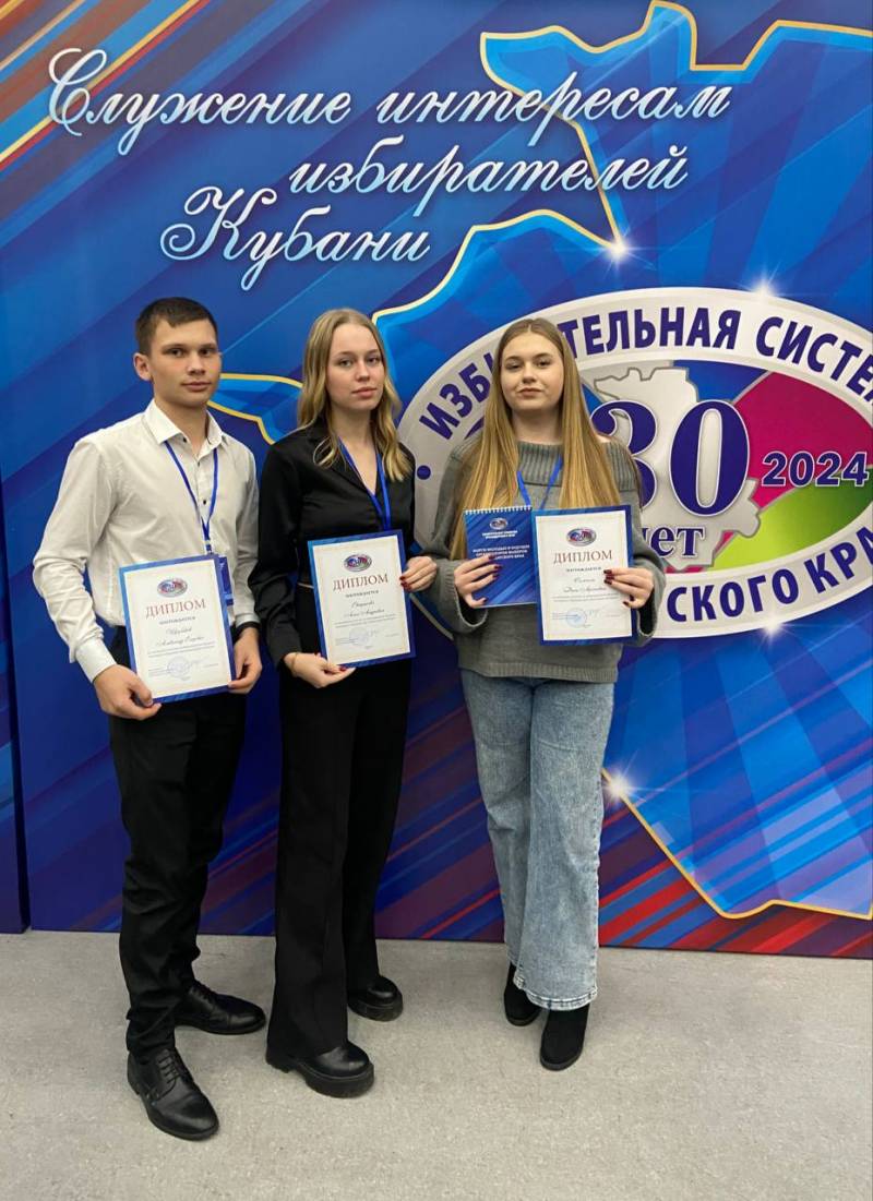 Члены молодежных общественных советов, избирательных комиссии собрались со всех муниципалитетов края в стенах Кубанского государственного университета, чтобы поделиться опытом лучших практик работы в молодежной среде, обсудить актуальные темы в области избирательного права и избирательного процесса. Во II части Форума к участникам присоединились председатель краевой избирательной комиссии Алексей Черненко, председатель комитета ЗСК КК по физической культуре, спорту, делам молодежи и взаимодействию с общественными объединениями Сергей Носов, представитель департамента внутренней политики администрации КК Василий Пархоменко, начальник управления молодежной политики министерства образования, науки и молодежной политики КК Андрей Холопик, проректор Кубанского государственного университета Николай Редькин. Приветственный адрес участникам Форума направила Председатель ЦИК России Элла Памфилова, отметив высокий уровень вовлеченности молодежи Кубани в электоральную тематику. Представители Отрадненского района: Щербаков Александр Егорович; Евтушенко Анна Андреевна; Симонян Дана Арсеновна. | |