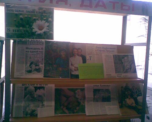 8 июля 2013 года для читателей Отрадненской межпоселенческой центральной библиотеки демонстрировалась говорящая книжно-иллюстративная выставка: «Слово о вечной любви» посвященная Всероссийскому празднику Дню семьи, любви и верности. Присутствовало 44 человека.Цель мероприятия: Популяризация Всероссийского праздника Дня семьи любви и верности. Популяризация семьи как источника любви, уважения, солидарности и привязанности, то, без чего не может существовать человек. Семья, для многих сегодня единственный символ стабильности, а порой и смысл всей жизни. Праздник учрежден в честь святых г. Мурома, Петра и Февронии, которые жили в XIII веке. Эту семейную пару православные христиане почитают как покровителей семьи и брака. Петр и Феврония стали образцами супружеской верности, взаимной любви и семейного счастья ещё при жизни. На выставке представлена литература а также статьи газет и журналов о создании и сохранении семьи; воспитании детей; семейном чтении, которое сближает и укрепляет семью, способствует развитию детей, формированию их личности. Также у книжной выставки на дисплее компьютера транслировался фильм о житие святых Петра и Февронии. | |