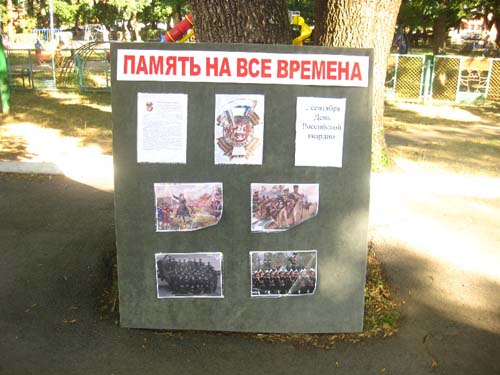 Память на все времена (тематический читальный зал под открытым небом) 29.08.13.Работниками районной детской и Отрадненской межпоселенческой центральной библиотек был организован тематический читальный зал под открытым небом, приуроченный ко дню Российской гвардии. Для всех желающих проводились беседы у одноименного стенда, работники библиотеки рассказывали читателям об истории возникновения и развитии российской гвардии, о том, что достойной преемницей традиций русской гвардии стала советская и нынешняя российская гвардия. В читальном зале была представлена литература и периодика по данной тематике, многие пользователи взяли данную литературу «на руки». Всего читальный зал посетило 26 человек. | |