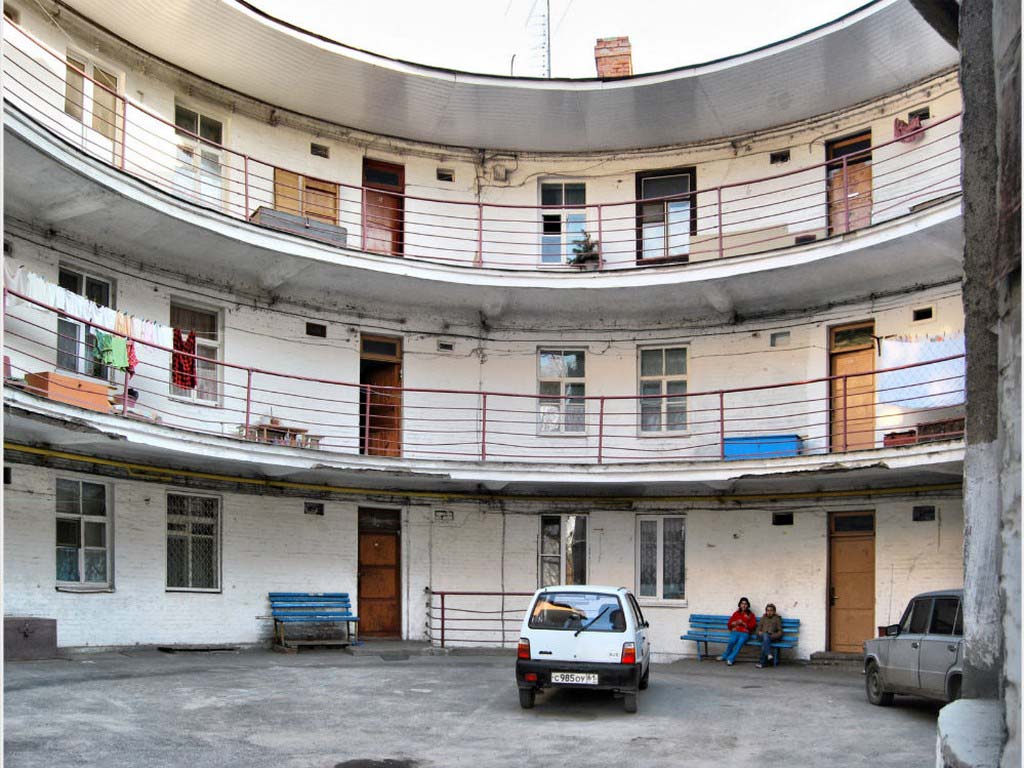 | #1 | «Круглый дом» построен в Таганроге в 1929 году по проекту архитектора Боголюбова. Этот жилой дом одного из заводов символизирует коммуну: в те годы шли поиски варианта идеального жилого дома. Дом напоминает пчелиную соту: минимум строительного материала и максимум жесткости и прочности. Общий балкон; тесный, совершенно круглый двор; ванные, предназначенные для семи семей (потом были «захвачены» ближайшими к ним квартирами).