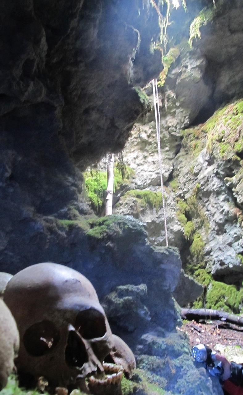 череп нормальный,прост. передний план.в 80-х здесь на Баранахе работала група археологов из Черкеска,они и нашли всё это(останки пещерного чела в "треугольной" и эти останки в "провале".на вскидку.по их предположениям, черепам около 100лет и они имеют характерные повреждения похожие на сабельный удар.По видимому в годы гражданской войны здесь кого-то казнили.Останком много как человеческих так и животных.Спускались по верёвке,глубина 12 метров.Так что ничего сверхестественного.