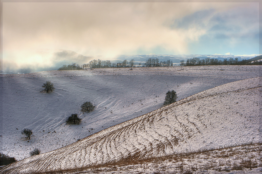 | Привет. Получилось наблюдать за быстронадвигающимся туманом, был он темной полоской на горизонте и приближался в мою сторону. Стало любопытно, думаю подожду пока придет, посмотрю что из этого будет. Получились несколько интересных кадров, туман пронизанный лучами солнца и т д, потом похолодало, стало холодно как у меня в холодильнике, тут я как-то проголодался и стал мечтать о теплой комнате с горячей едой))) пришлось срочно ретироваться вниз. В общем замерз. Здесь кадры сохранял в jpeg, очень редко сохраняю в raw и то если знаю что эту панораму в будущем буду печатать, в raw-е она лучше поддается обработке. Сильно кадр не мучаю, работаю с кривыми. | |
